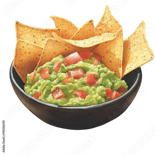 Guacamole dip and tortilla chips transparent background watercolor style artistic food illustration