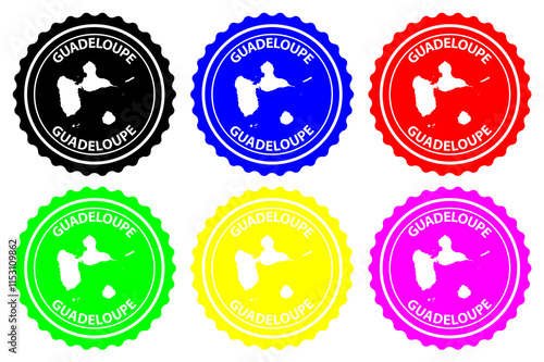 Guadeloupe - rubber stamp - vector, Guadeloupe island map pattern - sticker - black, blue, green, yellow, purple and red