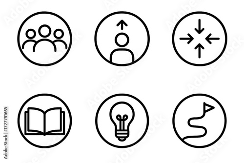 Guidance Icons Collection. Guidance circle icons in outline style: people in a circle, leader figure, arrows inward, book, lightbulb, path icon