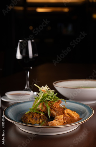 Guiso de carne con vino en la mesa de un restaurante, comida gourmet