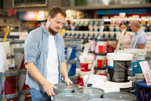 Guy examine bucket of paint and buys, collect necessary supplies in store for apartment renovation repairs. Construction items, paint and varnish products, accessories, supermarket
