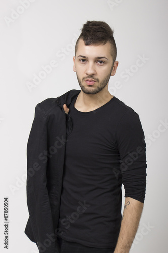 caucasian, black shirt, front view, male, mohawk, tattoo, tattoo, white background