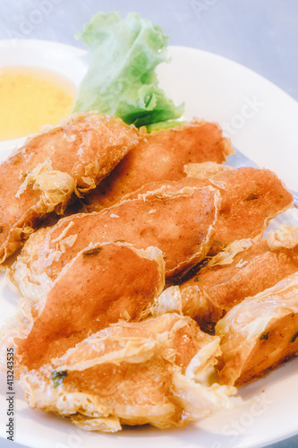 "Hae Keung" deep fried shrimp rolled or shrimp ball wrapped with tofu skin served with plum sauce and vegetable on white plate. Chinese traditional cuisine concept