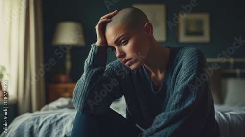 alopecia, hair, loss, cosy, bedchamber, sitting, edge, bed, emotional, lifestyle, article, room, soft, lighting