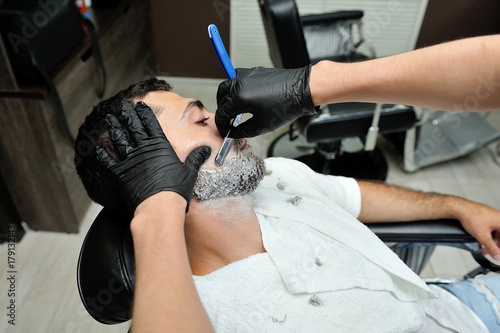 Hairdresser shaves man's beard with a blade in a male barber shop