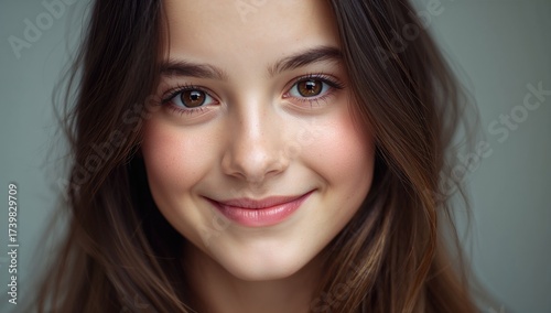 Half-face portrait of a smiling teenage girl with long brown hair and captivating brown eyes against a soft neutral background