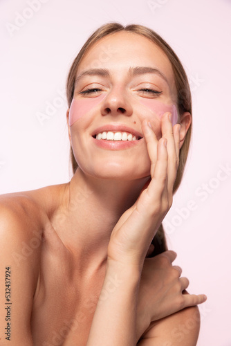 Half-legnth portrait of smiling beautiful girl with naked shoulders applying eye patches isolated over white background