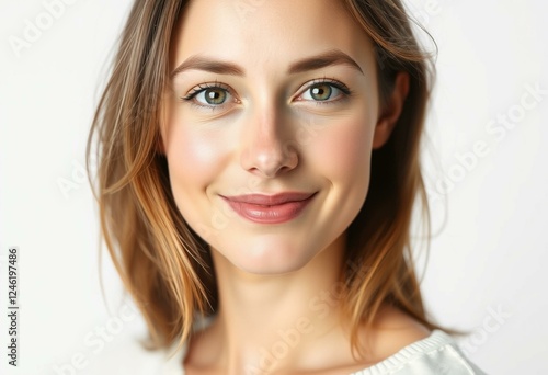 line, gentle, hair, soft, sharp, direct, facial, background, effortless, human, make-up, style, space, insertion, side, feature, white, expression, skin, dimension, eye, relaxed, photorealistic, smile, subtile, atmosphere, calm, sharpened, people, natural, copy, serene, mood, lighting, delicate, appearance, portrait, depth, light, youthful, gaze, female