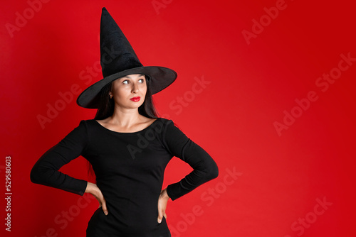 Halloween. A young beautiful woman in a witch's hat and a black dress on a red colored background. Space for text.
