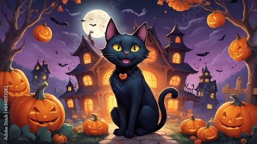 Halloween background cat perched on a pumpkin and a bat swooping through the night sky