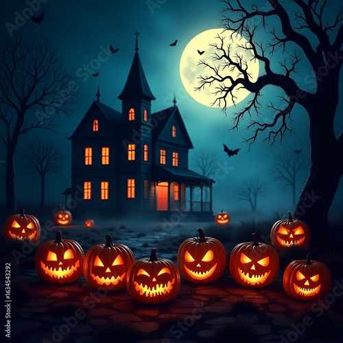 Halloween background glowing pumpkins haunted house spooky night fog autumn atmosphere