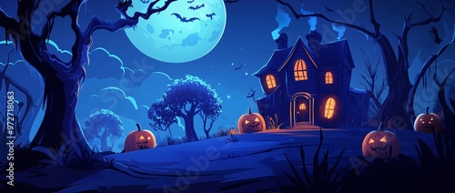 Halloween background with a haunted house, spooky trees, and pumpkins on a blue moonlit night. Cartoon vector illustration design