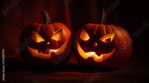 Halloween Background with Carved Pumpkins and Jack O’ Lantern Faces Against Dark Night