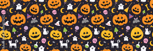 halloween, background, pattern, seamless, vector, banner, pumpkin, header, panoramic, texture, icon, element, hand, drawn, cute, children, lantern, ghost, cat, skull, spider, bat, candy, star, moon, magic, illustration, cartoon, smiley, happy, graphic, scarey, wallpaper, fabric, product, textile, colourful, design, concept, poster, card, face, silhouette, celebration, creative, holiday, decoration, flat, party
