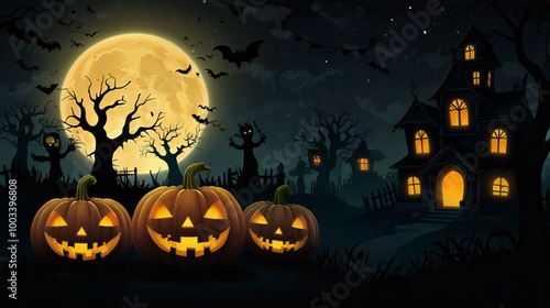 halloween, pumpkin, autumn, night, moon, vector, bat, horror, holiday, illustration, october, skittish, celebration, dark, scarey, black, tree, cartoon, orange, design, silhouette, evil, card, fear, sorcerer
