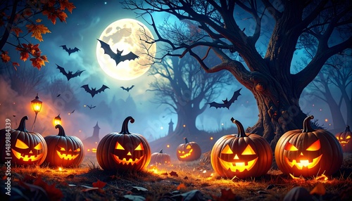 halloween, pumpkin, moon, night, bat, autumn, skittish, horror, holiday, vector, dark, illustration, sky, silhouette, tree, scarey, cartoon, house, october, black, evil, cemetery, castle, design, haunted