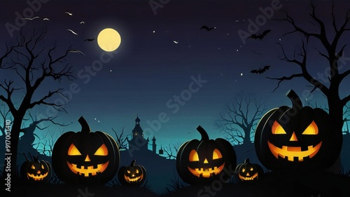 halloween, pumpkin, autumn, night, moon, bat, vector, holiday, horror, illustration, scarey, dark, skittish, october, black, design, orange, celebration, tree, silhouette, cartoon, evil, sorcerer, fear, party
