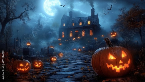 halloween, pumpkin, jack-o-lantern, grave, cemetery, tree, moon, background, night, dark, mystery, horror, tomb, skittish, fear, scarey, fog, moonlight, design, full, autumn, celebration, landscape, gravestone, concept, nightmare, forest, scene, art, gothic, devil, evil, creepy, october, holiday