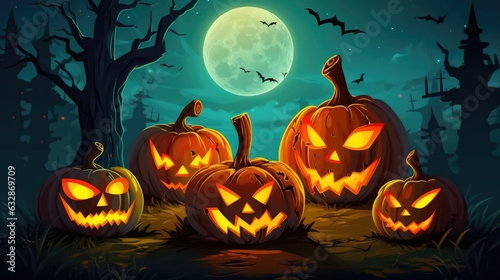 pumpkin, halloween, horror, autumn, night, october, holiday, skittish, dark, evil, lantern, celebration, scarey, moon, background, season, glowing, fear, orange, ghost, fun, jack, creepy, bat, treat, trick, vector, decoration, fall, black, carved, mystery, tree, illustration, design, jack-o-lantern, smile, happy, forest, face, card, generative, ai