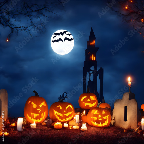 Halloween background with scary pumpkins candles in the graveyard at night with a castle background , illustration, vector, eps