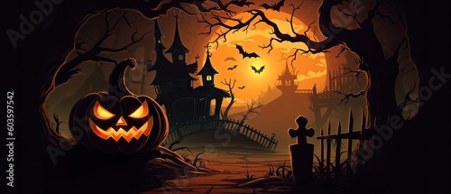 halloween, pumpkin, autumn, holiday, horror, night, bat, illustration, moon, scarey, celebration, orange, october, tree, skittish, design, dark, silhouette, cartoon, black, frame, card, lantern, ai