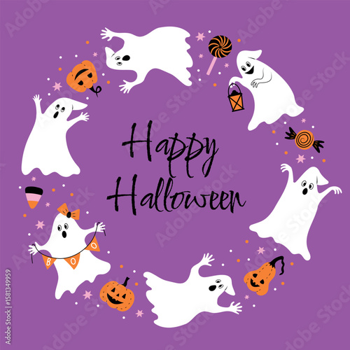 halloween banner with ghosts pumpkins and candy,vector illustration.