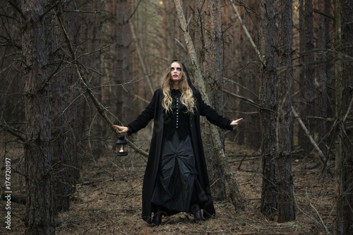 Halloween. beautiful girl with a lantern in a black dress in the forest.