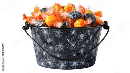 Halloween candy bucket used as centerpiece, decorated with spiderweb, isolated on white background