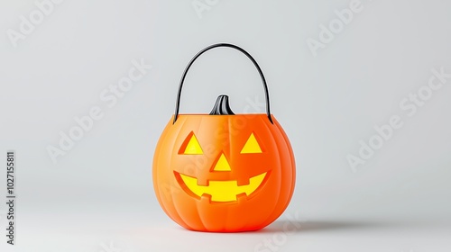 Halloween candy bucket, with a simple round shape and a smiling face, glowing faintly from the inside, placed on a flat surface.