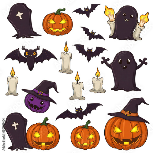 halloween, sticker, cartoon, pumpkin, bat, ghost, candle, gravestone, sorcerer, hat, clip art, illustration, graphic, design element, isolated, skittish, cute, holiday, vector