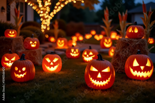 Halloween celebration with glowing jack-o'-lanterns and festive outdoor decorations