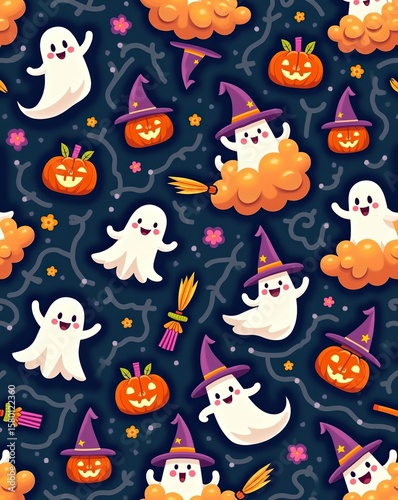 halloween, pattern, ghost, pumpkin, sorcerer, hat, skittish, cute, festive, holiday, celebration, orange, purple, character, design, illustration, cartoon, whimsical, autumn, fall, motif, repeat, background, decoration, season, seasonal, party, trick