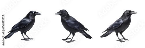 Halloween crow perched with an eerie, classic pose, featuring detailed feathers and a slightly menacing expression, isolated on a transparent background.