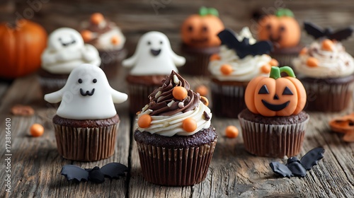 Halloween cupcakes designed with candy pumpkins smiling ghosts and bats arranged on rustic wooden table spooky cute