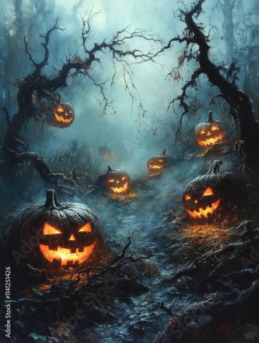 Halloween Dark Eerie Landscape with Glowing Jack-O'-Lanterns and Twisted Branches in Gothic Horror Art Style