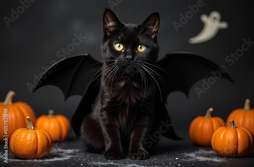 Halloween design concept featuring a black cat in a bat costume, with a pumpkin