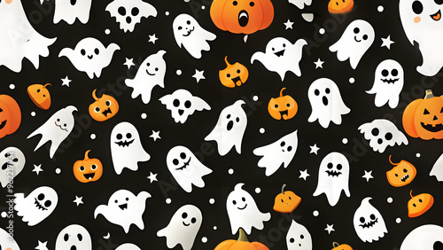 Halloween ghost cartoon seamless pattern. Colorful cartoon ghosts in a seamless repeat pattern wallpaper. Black and white October holiday spirit ghosts doodle character background.