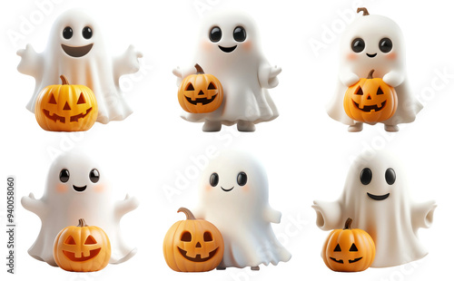 Halloween ghost figurines holding pumpkins isolated on transparent background