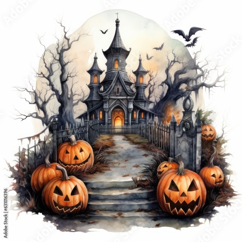 Halloween. Happy Halloween Fantasy Illustration with Halloween pumpkin, trees, house, moon on the background of old gothic castles. Fantasy poster for halloween. Generative Ai