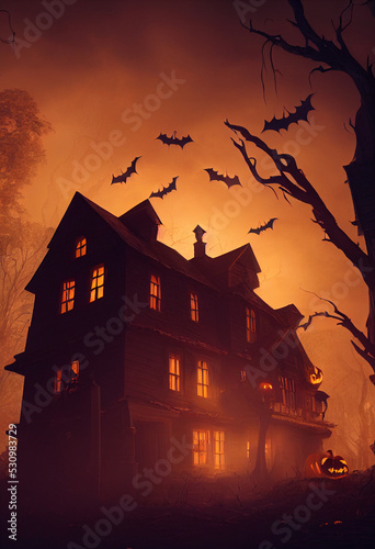 Halloween Haus Hintergrund für Flyer mit Fledermäusen, generative ai technology