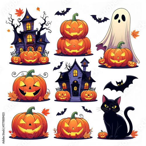 Halloween illustration set with haunted houses, glowing jack-o’-lanterns, black cat, bats, and ghost on white background, perfect for spooky holiday decorations and designs