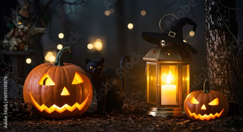 halloween, pumpkin, lantern, jack-o-lantern, candle, leaf, dark, forest, skittish, autumn, holiday, orange, light, warm, decoration, black cat, carved, glowing, fall, decor, scarey, night, creepy, wood, shadowy, mystical, festive, image, seasonal, dark background, graphic, photo, copy space, lantern light, autumn leaf, illustration, night scene