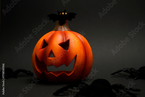 Halloween jack-o-lantern with bat and spider creating eerie decoration symbolizing mystery, darkness, and spooky festive atmosphere