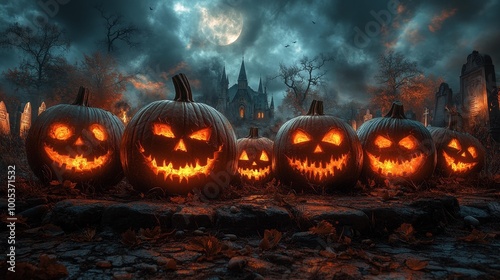 Halloween Jack-o'-Lanterns in Spooky Graveyard Generative AI