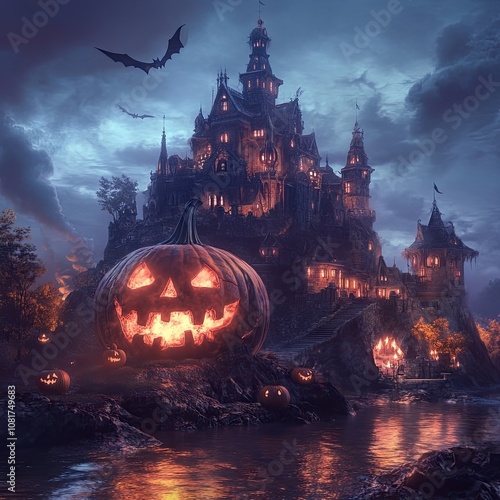 Halloween merayakan latar belakang dengan Pumpkin and horror Castle. Latar Belakang Horror Halloween.