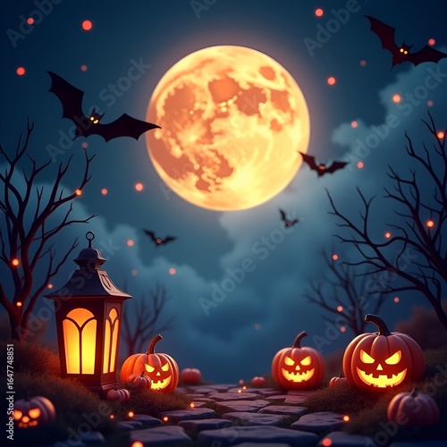 Halloween Night Decorative Scene with Bats Moon Fog and Glowing Pumpkins