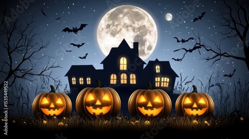 Halloween night scene featuring jack o lanterns in a field, silhouetted haunted house against a full moon, and bats flying across a starry sky. Spooky seasonal concept.