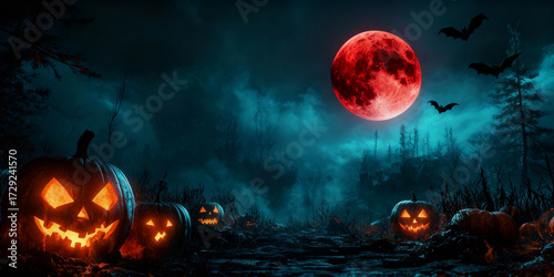 Halloween Night Scene with Jack O Lanterns Under a Red Moon
