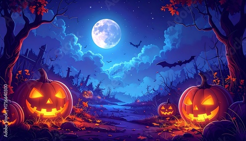 halloween, pumpkin, full moon, night, skittish, eerie, bat, autumn, fall, celebration, festive, glowing, landscape, tree, dark, scarey, holiday, season, october, moonlight, sky, cloud, silhouette, foliage, orange, blue, art, illustration, digital artwork, fantasy, background, wallpaper, design, scene, night time, atmosphere, seasonal, decorative, event, horror, magic, mystery, nature, rural, countryside, twilight, vibrant