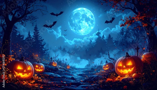 Halloween Night Scene with Pumpkins, Moon, and Bats.